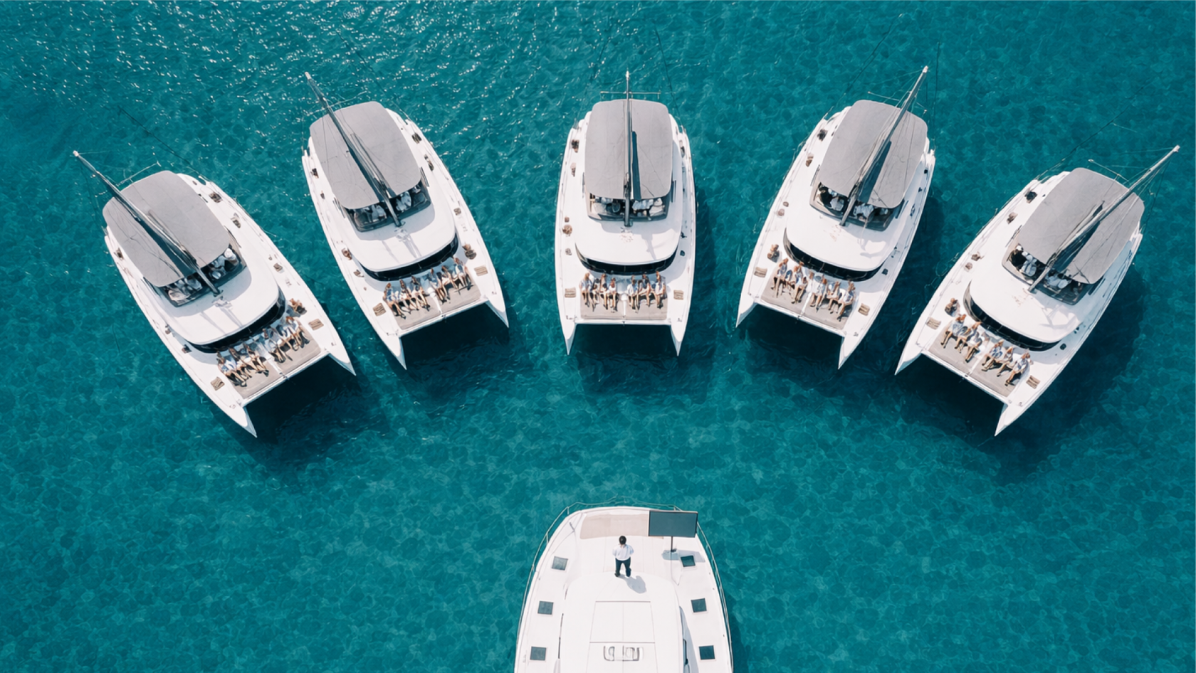 Open Sea Summit - это формат полноценной конференции в море, где сама площадка становится частью программы. Несколько катамаранов соединяются в единую устойчивую платформу - “остров” в открытой воде. В центре расположена сцена на воде, вокруг - аудитория, выстроенная амфитеатром: гости находятся на платформе и на ближайших катамаранах.
